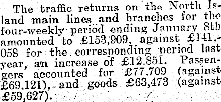 The traffic returns on the North Island main lines and branches for the tour-weekly period ending January otli amounted to £153,909.. against £141.058 for the. corresponding period last year, an increase of £12.851. Pas?enwers accounted for £77,709 (against £69 121), and goods £63,473 (against £59,627).