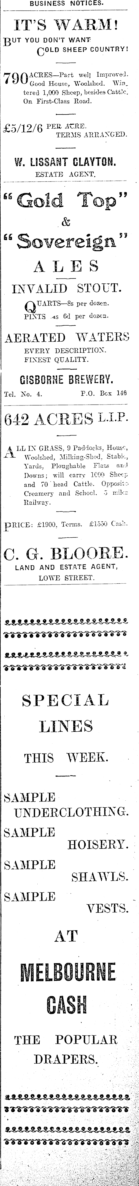 BUSINESS NOTICES. IT’S WARM! RUT YOU DON’T WANT QOLD SHEEP COUNTRY! O/A ACRES—Part well Improved. i*J vJ Qood House, WooLshed. Win. tered 1,000 Sheep, besides Cattle. On First-Class Road. £5/12/6 PER ACRE. TERMS ARRANGED. W. LiSSANT CLAYTON. ESTATE AGENT. “ Gold Top” & 65 Sovereign” ALES INVALID STOUT. —Bs per dozen. PINTS -is 6d per dozen. AERATED WATERS EVERY DESCRIPTION. FINEST QUALITY. GISBORNE BREWERY. Tel. No. 4. P.O. Bos 146 64-2 ACRES L.I.P. 4 LL IN GRASS, 9 Paddocks. Hons-':. Wool shed, Milking-Shod, Stable, Yards, Plonghable Flans and Downs; will carry ICOO Sheep and 70 ' head Cattle. OpposiiCreamery and School, d miles Railway. pRICE: £I9OO, Terms. £1550 Cash. C. G. BLOORE. LAND AND ESTATE AGENT, LOWE STREET. 'rrrrrrrrrrrrrrrrrrrs SPECIAL LINES THIS WEEK. SAMPLE UNDERCLOTHING. SAMPLE HOISERY. SAMP LE SHAWLS. SAMPLE VESTS. AT MELBOURNE GASH THE POPULAR DRAPERS. ‘rrrr^rrrrrrrrrrrrrrs? Si ; C