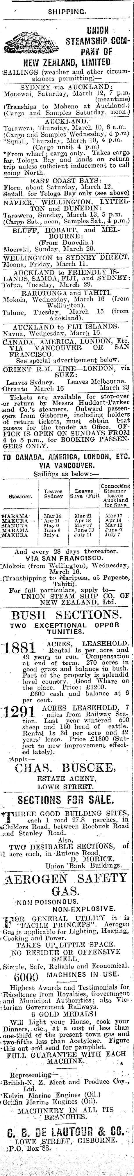 SHIPPING. mm steamship Compaq of NEW ZEALAND, LIMITED SAILINGS (weather and other circumstances permitting)— SYDNEY via AUCKLAND: Monowai, Saturday, March 12, 7 p.m. (meantime) (Tranships to Maheno at Auckland.) (Cargo and Samples Saturday, noon.) '■ AUCKLAND. ' Tarawera, Thursday, March 10, 6 a.m. (Cargo and Samples Wednesday, 4 p.m) * Squall, Thursday, March 10, 4 p.m. (Cargo until 4 p.m) ‘From wharf ; cargQ only. Takes cargo for. Tologa Bay and lands on return trip unless sufficient inducement to call going North. EAST COAST BAYS: Flora, about Saturday, March 12. Soliall. for Tologa Bay only (see above) NAPIEIV'WELLINGTON, LYTTELTON and DUNEDIN TaravVera, Sunday, March 13, 5 p.in. (Cargo Sat., noon, .Samples Sat., 4 p.m.) BLUFF, HOBART, and MELBOURNE : (From Dunedin.) Moernki, Sunday, March 20. WELLINGTON to SYDNEY DIRECT. Moana, Friday, March 11. AUCKLAND to FRIENDLY ISLANDS, SAMOA, FIJI, and SYDNEY: Tofua, Tuesday, March 29. RAROTONGA and TAHITI. Mokoia, Wednesday, March 18 (from Wellington). Talune, Tuesday, March 15 (from Auckland). AUCKLAND to FIJI ISLANDS. Navua, Wednesday, March 16CANADA, AMERICA, LONDON, Etc VIA VANCOUVER OR SAN FRANCISCO. See special advertisement below. ORIENT E M. LINE —LONDON, via SUEZ: Leaves Sydney. Leaves Melbourne.. Otranto March 16 March 23 Tickets are available for stop-over .or return by Messrs Huddart-Parker .and Co.’s steamers. Outward passen.gers from Gisborne, including holders of return tickets, must obtain boat passes for the tender at Office. OFFICE IS OPEN ON SUNDAY’S FROM 4 to 5 p.m., for BOOKING PASSENGERS ONLY. TO CANADA. AMERICA, LONDON, ETC, VIA VANCOUVER. Sailings as below:— And every 28 days thereafter. VIA SAN FRANCISCO. Mokoia (from Wellington), Wednesday, March 16. (Transhipping to Mariposa, at Papeete, Tahiti). For full particulars, apply to— UNION STEAM SHIP CO. OF NEW ZEALAND, Ltd. BUSH SECTIONS. TWO EXCEPTIONAL OPPOR TUNITIES. | QQ-j ACRES, LEASEHOLD. [.OOI Rental Is per. acre and 49 years to run. Compensation at end of term. 270 acres in good grass and balance in bush. Part of the property is splendid level country. Good Whare on the place. Price: £I2OO. £6OO cash and balance at 6 per cent. I 00l ACRES LEASEHOLD, 7 L. tJ JL miles from Railway Station. Last year wintered 500 sheep and 150 head of cattle. Rental Is 3d per acre and 42 years’ lease. Price £I3OO (Subject to new improvement effected latoly). Applv— CHAS. BUSCKE, ESTATE AGENT, LOWE STREET. THREE GOOD BUILDING SITES, each 1 rood 27.8 perches, in Road, between Roebuck Road .and Stanley Road. Also, TWO DESIRABLE SECTIONS, of rd acre each, in 'Rutone Road. D. MORICE, j Union 'Bank Buildings. AEROGUN SAFETY GAS. NON POISONOUS. NON-EXPLOSIVE. XT OR GENERAL UTILITY it is V “FACILE PRINCEPS”. Aerogen Gas is applicable for Lighting, Heating, ! Cooking and Power. TAKES UI\LITTLE SPACE. NO RESIDUE OR OFFENSIVE SMELL; . Simple, Safe, Reliable and Economical. 6000 MACH,NES IN USE - ! Highest Awards and Testimonials lor Excellence from Royalties, Government ■ and Municipal Authorities; also Vic- • -torian Government Railways. 6 GOLD MEDALS! Will Light your House, cook your Dinners, .etc., "at a cost of less than . one-third of -the present town gas and . two-fifths less than Acetylene. Figure this out arid send for pamphlet. j FULL GUARANTEE WITH EACH ! MACHINE. ’ Representnig — • : British-N. Z. Meat and Produce Coy., Ltd. 'Kelvin Marine Engines (Oil.) j <Griffin Marine Engines (Oil). j MACHINERY IN ALL ITS i . BRANCHES. G. B. BE LAUTOOB & GO. | LOWE .STREET. GISBORNE. ; j ;P.O. Box'3B,