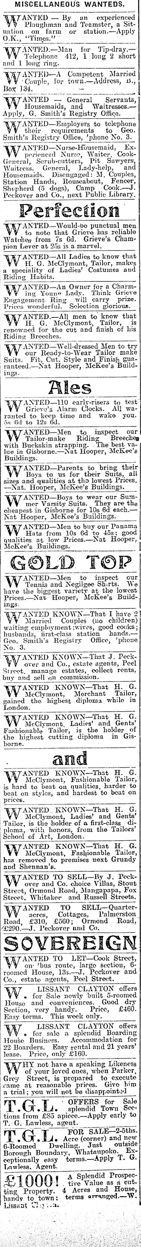 MISCELLANEOUS WANTEDS. TO£7 ANTED —By an experienced V y Ploughman and Teamster, a Situation. on farm or station. —Apply 0.K., “Times.” WANTED. —Man for Tip-dray. — Telephone 412, 1 long 2 short and 1 long ring. WANTED— A Competent Married •Couple, for town—Address, 8., Box 134. "Or ANTED General Servants, V 7 Housemaids, and Waitresses. — Apply, G. Smith’s Registry Office. WANTED —Employers to telephone their requirements to Geo. Smith’s Registry Office, ’phone No. 3. WANTED —Nurse-Housemaid, Experienced Nurse, Waiter. CookGeneral, Scrub-cutters, Pit Sawyers, Waitress, General, Lady-help, and Housemaids. Disengaged: M. Couples, Station Hands, Rouseabout, Fencer, Shepherd (5 dogs), Camp Cook.—J. Peckover and Co., next Public Library. Perfection WANTED —Would-be punctual men to note that Grieve has reliable Watches from 7s Gd. Grieve’s Champion Lever at 25s is a marvel. WANTED— All Ladies to know that H. G. McClymont, Tailor, makes a speciality of Ladies’ Costumes and Riding Habits. WANTED —An Owner for a Charming Youn" Lady. Think Grieve Engagement Ring will carry prize. Prices wonderful. So lection glorious. WANTED.— All men to know that H. G. McClymont, Tailor, is renowned for the cut and finish of his Riding Breeches. WANTED —Well-dressed Men to try our Ready-to-Wear Tailor make Suits. Fit, Cut, Style and Finish guaranteed.—Nat Hooper, McKee’s Buildings. Ales WANTED —110 early-risers to test Grieve’s Alarm Clocks. All waranted to keep time and wake you. os Od to 12s 6d. WANTED— Men to inspect our Tailor-make Riding Breechqa with Buckskin strapping. The best value in Gisborne. —Nat Hooper, McKee’s Buildings. ANTED—Parents to bring their Boys to us for their Suits, all sizes and qualities at tho lowest Prices. —Nat. Hooper, McKee’s Buildings. WANTED —Boys to wear our Summer Varsity Suits. They are the cheapest in Gisborne for 10s 6d each.— Nat Hooper, McKee’s Buildings. WANTED —Men to buy our Panama Hats from 10s 6d to 455: good qualities at low Prices.—Nat Hooper, McKee’s Buildings. - GOLO~T©P WANTED— Men to inspect our Tennis and Negilgee Sh.rts. We have the biggest variety at the lowest Prices.—Nan Hooper, McKee’s Buildings. WANTED KNOWN—That. I have 2 Married Couples (no children) waiting employment ;\vivos, good cooks • husbands, first-class station hands.— Geo. Smith’s Registry Office, ’phone No. 3. ' WANTED KNOWN—That J. Peckover and Co., estate agents, Peel Street, manage estates, collect rents, buy and sell on commission. WANTED KNOWN—That H. G. McClymont, Merchant Tailor, gained the. highest diploma while in London. ANTED KNOWN —That H. G. McClymont. Ladies’ and Gents’ Fashionable Tailor, is the holder of the highest cutting diploma in Gisborne. _____ and WANTED KNOWN—That H. G. McClymont, Fashionable Tailor, is hard to beat on qualities, harder to beat on styles, and hardest to beat on prices. WANTED KNOWN—That H. G. McClymont, Ladies’ and Gents’ Tailor, is the holder of a first-class diploma, with honors, from the Tailors’ School of Art, London. __ ANTED” KNOWN—That H. G. McClymont, Fashionable Tailor, has removed to premises next Grundy and Shennan’e. WANTED TO SELL—By J. Peckover and Co. choice Villas, Stout Street, Ormond Road, Mangapapa, Fox Street, Whitaker and Russell Streets. WANTED TO SELL—Quarteracres, Cottages, Palmerston Road, £3lO, £560; Ormond Road, 7 £290.—J. Peckover and Co. SOVEREIGN WANTED TO LET—Cook Street, on- ’bus route, largo section, 6roomed House, 13s.—J. Peckover and Co., estate agents, Peel Street. USSANT" CLAYTON offers • for Sale newly built 5-roomed House and conveniences. Good dry Section, very handy. Price, £460. Easy terms. This week only. LISSANT CLAYTON offers e for sale a splendid Boarding House Business. Accommodation for 22 Boarders. Easy rental and 21 years’ lease. Price, only £l6O. HTTHY not have a speaking Likeness f V of your loved ones, when Parker, rcy Street, is prepared to execute me at reasonable prices. Give bun trial; you will not be disappointed r.G.L. OFFERS for Sale splendid Town Seems from £SS apiece.—Apply early to G. Lawless, agent. T FOR SALE—2-sths. •VXe JJ • Acre (corner) and new Roomed Dwelling. Just outside irongli Boundary, Whataupoko. Exptionally easy tor ms. —Apply 1 • G. iwless. Agent. li AAAj A Splendid Prospectier Property. 4 Acres and House, ndv to town; terms arranged—W. serial Chj'.-a.