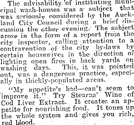 The advisability.-of instituting municipal wash-houses was a subject that •was seriously considered by the Auckland City Council during a _ brief discussion the other •evening.' The subject arose in the form of a report from the city inspector, calling- attention to a contravention of the city by-laws by certain housewives in the direction oi lighting open iires in back yards on washing davs. This, it was pointed out, was a dangerous practice, especially in thickly-populated areas. “My appetite’s bad—can’t seem to improve it.” Try Stearns’ Wine of Cod Liver Extract. It creates an appetite for nourishing food. It tones up the whole system, and:gives you rich, red blood.