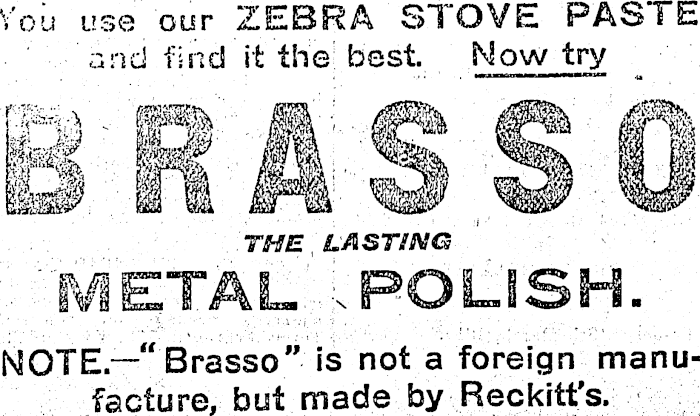 You use our ZEBRA STOVE PASTE and find it the best. Mow try m THE LASTING METAL .POLISH. NOTE.—" Brasso" is not a foreign manufacture, but made by Reckitt's.