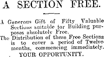 A SECTION FREE. A Generous Gift of Fifty Valuable Sections suitable for Building purposes absolutely Free. The Distribution of these Free Sections is to cover a period of Twelve months, commencing immediately. YOUR OPPORTUNITY.