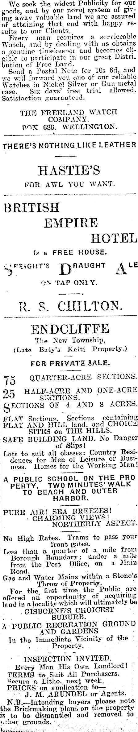 We sock tlie widest Publicity for our goods, and by our novel system of giving awav valuable land we are assured of attaining that end with happy results to our Clients. Every man rermiros a serviceable Watch, and by dealing with us obtains a genuine timekeeper and becomes eligible to participate in our great Distri. but ion of Free Land. Send a Postal Note for 10s 6d, and we will forward you one of cur reliable Watches in Nickel Silver or Gun-metal case. Six days’ free trial allowed. Satisfaction guaranteed. THE FREELAND WATCH COMPANY POX 656. WELLINGTON. THERE’S NOTHING LIKE LEATHER HASTIE’S FOR. AWL YOU WANT. BRITISH EMPIRE HOTEL fs a FREE HOUSE. < f'EiGHT’S I) RAUGHT ON TAP ONI Y. A LE R. R. CHILTON. ENDCLIEFE The New Township, (Late Baty’s Kaiti Property.) FOR PRIVATE SALE. 75 25 QUARTER-ACRE SECTIONS. ONE-ACRE S ACRES. HALF-ACRE AND SECTIONS. gE CTIONS OF 4 AND FLAT Sections, Sections containing FLAT AND HILL land, and CHOICE SITES on THE HILLS. SAFE BUILDING LAND. No Danger of Slips I Lots to suit all classes: Country Residences for Men of Leisure or - Business. Homes for the Working Man. A PUBLIC SCHOOL ON THE PRO PERTY. TWO MINUTES’WALK TO BEACH AND OUTER HARBOR. URE AIR I SEA BREEZES 1 CHARMING VIEWS! , NORTHERLY A SPEC 1. No High Rates. Trams to pass your front gates. Less than a quarter of a mile from Borough Boundary; under a mile from the Post Office, on a Slam Road. . , Gas and Water Mains witlnn a Stone s Throw of Property. For the first time the Public are offered aii opportunity of acquiring land in a locality which will ultimately be GISBORNE’S CHOICEST SUBURB. A PUBLIC RECREATION GROUND AND GARDENS In the Immediate Vicinity of the Property. INSPECTION INVITED. Every Man His Own Landlord 1 TERMS to. Suit All Purchasers. Secure a Litho. next week. PRICES on application to— J. M. ARUNDEL or Agents. N.B.—lntending buyers please note the Brickmaking plant on the property is to be dismantled and removed to other grounds.