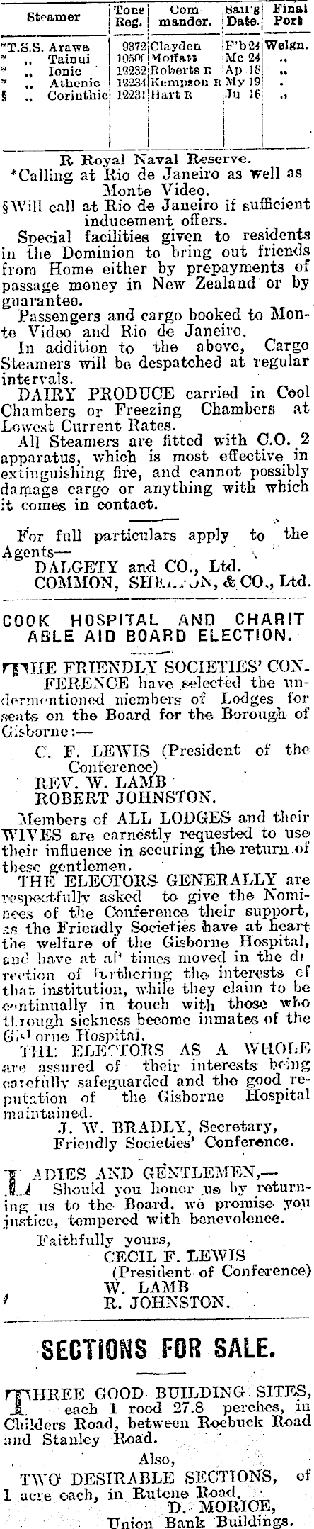 R Royal Naval Reserve. * Calling at Itio de Janeiro as well as Monte Video. § Will call at Rio de Janeiro if sufficient inducement offers. Special facilities given to residents in the Dominion to bring out friends from Home either by prepayments of passage money in New Zealand or by guarantee. Passengers and cargo booked to Monte Video and Rio de Janeiro. In addition to the above, Cargo Steamers will be despatched at regular intervals. DAIRY PRODUCE carried in Cool Chambers or Freezing Chambers at Lowest Current Rates. All Steamers are fitted with C.O. 2 apparatus, which is most effective in extinguishing fire, and cannot possibly damage cargo or anything with which it comes in contact. For full particulars apply to the Agents — DALGETY and CO., Ltd. COMMON, SHKi.roN, & CO., Ltd. COOK HOSPITAL AND CHARIT ABLE AID BOARD ELECTION. nriHE FRIENDLY SOCIETIES’ CONFERENCE have selected the undermentioned members of Lodges for seats on the Board for the Borough of Gisborne: — C. F. LEWIS (President of the Conference) REV. W. LAMB ROBERT JOHNSTON. Members of ALL LODGES and their WIVES are earnestly requested to usetlieir influence in securing the return of these gentlemen. THE ELECTORS GENERALLY are respectfully asked to give the Nominees of the Conference, their support’, rp. the Friendly Societies have at heart tiie welfare of the Gisborne Hospital, and have at al s times moved in the di ■rtvtion of furthering the interests of tliar, institution, while they claim to be continually in touch with those who 11. rough sickness become inmates of the Gb 1 or no Hospital. Till: ELECTORS AS A WHOLE are assured of their interests being carefully safeguarded and the good reputation of the Gisborne Hospital maintained. J. W. BRADLY, Secretary, Friendly Societies’ Conference. A DIES AND GENTLEMEN,— A Should you honor us by returning us to the Board, ive promise you justice, tempered with benevolence. Faithfully yours, CECIL F. LEWIS (President of Conference) W. LAMB > R. JOHNSTON. SECTIONS FOR SALE. HREE GOOD BUILDING SITES, each 1 rood 27.8 perches, in Childers Road, between Roebuck Road and Stanley Road. Also, TWO 1 DESIRABLE SECTIONS, of 1 each, in Butene Union Bank Buildings.