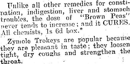 T T nlike all other remedies for constipation, .indigestion, liver and stomach troubles, the dose of “Brown Peas never tends to increase ; and it All chemists, Is 6d box.* Zvmolo Trokeys are popular because thev are pleasant in taste; they loosen tight, dry coughs and strengthen the throat.