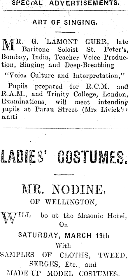 SPECrAL ADVERTISEMENTS. ART OF SINGING. M'll. G. ‘LAMONT GURII, late Baritone Soloist St. Peter’s, Bombay, India, Teaclier Voice Production, Singing and Deep-Breathing “Voice Culture and Interpretation,” Pupils prepared for R.C.M. and R.A.M., and Trinity College, London, Examinations, will meet intending jupils at Parau Street (Mrs LivickV > ivaiti LADIES’ OOSTUME MR. NODINE, OF WELLINGTON, '^*y r ILL be at the Masonic Hotel, SATURDAY, MARCH 19tli With SAMPLES OF CLOTHS, TWEED, SERGES, Etc., and MADE-UP MODEL COSTUMES.
