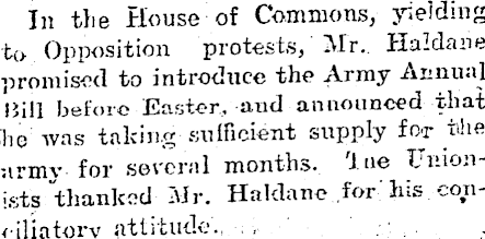In the House of Commons, yielding to Opposition protests, Mr. Haldane promised to introduce the Army Annual Bill before Easter, and announced that he was talcing sufficient supply for the army for several months. Toe Unionists thanked Mr. Haldane for his conciliatory attitude. ~