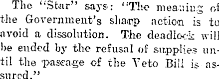 The “Star” says: “The meaning of the Government’s sharp action is to avoid a dissolution. The deadlock will he ended by the refusal of supplies until the 'passage of the Veto Bill is assured.”