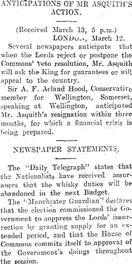 ANTICIPATIONS OF MR ASQUITH’S ACTION. (Received March 13, 5 p.m.) LON Dm,, March 12. Several newspapers anticipate that when the Lords reject- or postpone the Commons’ Veto resolution, Mr. Asquith will ask the King for guarantees or will appeal to the country. Sir A. F. Aoland Hood, Conservative member for Wellington, Somerset, speaking at Wellington, anticipated Mr. Asquith’s resignation within three mouths, for which a financial crisis is being prepared. NEWSPAPER STATEMENTS. The “Daily Telegraph” states that xho Nationalists have received assurances that the whisky duties Will be abandoned in the next Budget. The “Manchester Guardian” declares that the election commissioned trie Government to suppress the Lords’ insurrection by granting supply for an extended period, and that the House of Commons commits itself to .approval of the Government’s doings throughout the session.