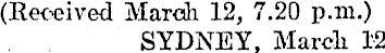 (Received March 12, 7.20 p.m.) SYDNEY, March 12