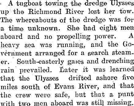 A tugboat towing the dredge Ulysses up the Richmond River lost her tow. The whereabouts of the dredge was for a time unknown. She had eight men aboard and no propelling power. A heavy sea was running, and the Government arranged for a search steamer. South-easterly gaies and drenching rain prevailed. Later it was learned that the Ulysses drifted ashore five miles south of Evans River, and that the crew were safe, but that a punt with two men aboard was still missing.