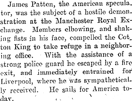 James Patten, the American speculator, was the subject of a hostile demonstration at the Manchester Royal Exchange. Members elbowing, and shaking fists in his face, compelled the Cot_ ton King to take refuge in a neighboring office- With the assistance of a strong police guard lie escaped by a fire exit, and immediately entrained for Liverpool, where he was sympathetically received. He sails for America today. < • >