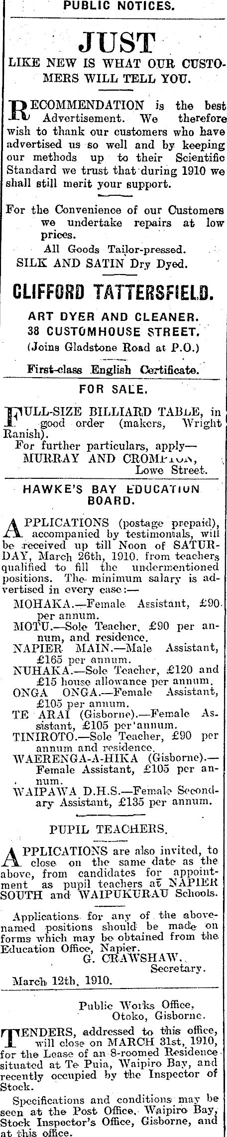 PUBLIC NOTICES. ' JUST LIKE NEW IS WHAT OUR CUSTOMERS WILL TELL YOU. Recommendation is the best Advertisement. We therefore wish to thank onr customers who have advertised us so well and by keeping our methods up to their Scientific Standard we trust that during 1910 we shall still merit your support. For the Convenience of our Customers we undertake repairs at low prices. All Goods Tailor-pressed. SILK AND SATIN Dry Dyed. CLIFFORD TATTERSFIELD. ART DYER AND CLEANER. 38 CUSTOMHOUSE STREET. (.Joinß Gladstone Road at P. 0.) First-class English Certificate. FOR SALE. BILLIARD TABUS, in good order (makers, Wright Ranish). For further particulars, apply— MURRAY AND Lowe Street. HAWKE’S BAY EDUCATION BOARD. APPLICATIONS (postage prepaid), accompanied by testimonnals, will be received up till Noon of SATURDAY, March 26tli, 1910. from teachers qualified to fill the undermentioned positions. The minimum salary is advertised in every case:— MOHAKA.—Female. Assistant, £9O per annum. MOTU.—SoIe Teacher, £9O per annum, and residence. NAPIER MAIN.—Male Assistant, £165 per annum. NUHAIvA.—SoIe Teacher, £l2O and £ls house allowance per annum. ONGA ONGA.—Female Assistant, £lO5 per annum. TE ARAI (Gisborne). —Female Assistant, £lO5 per'annum. TINIROTO.—SoIe Teacher, £9O per annum and residence. WAERENGA-A-HIKA (Gisborne).— Female Assistant, £lO5 per an- . num. WA IP AAV A D.H.S. —Female Secondary Assistant, £135 per annum. PUPIL TEACHERS. Applications are also invited, to close on the same date as the above, from candidates for appomtment as pupil teachers at NAPIER SOUTH and AVAIPUKTTRATJ Schools. Applications for any of the abovenamed positions should be made on forms which may be obtained from the Education Office, Napier. G. ORAWSHAAV, Secretary. March 12th. 1910. Public AA’oi'ks Office, Otoko, Gisborne. TENDERS, addressed to this office, will close on MARCH 31st, 1910, for the Lease of an 8-roomed Residence situated at Te Puia, AVaipiro Bay, and recently occupied by the Inspector of Stock. Specifications and conditions may be seen at the Post Office. AVaipiro Bay, Stock Inspector’s Office, Gisborne, and at this office.