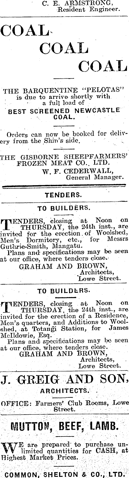 C. E. ARMSTRONG, Resident Engineer. COAL COAL COAL THE BARQUENTINE “PELOTAS’ is due to arrive- shortly with a full load of BEST SCREENED NEWCASTLE COAL. Orders can now be booked for delivery from the Shin’s side. THE GISBORNE SHEEPFARMERS’ FROZEN MEAT CO.. LTD. W. F. CEDERWALL, General Manager. TENDERS. TO BUILDERS. TENDERS, closing at Noon on THURSDAY, the 24th inst., are invited for the erection. of Wooished, Men’s Dormitory, etc., for Messrs Guthrie-Smith, Mangatu. Plans and 1 specifications may be seen at our office, where tenders close. GRAHAM AND BROWN, Architects, Lowe Street. TO BUILDERS. TENDERS, closing at Noon on THURSDAY, the 24th inst., are invited for the erection of a Residence, Men’s quarters, and Additions to Woolshed, at Totangi Station, for James Mclldowie, Esq. Plans and specifications may be seen at our office, where tenders close. GRAHAM AND BROWN, Architects, Lowe Street. J. GREIG AND SON. ARCHITECTS. , OFFICE: Farmers’ Club Rooms, .Lowe Street. MUTTON, BEEF, LAMB. WE are prepared to purchase unlimited quantities for CASH, at Highest Market Prices. COMMON, SHELTON & CO., LTD.