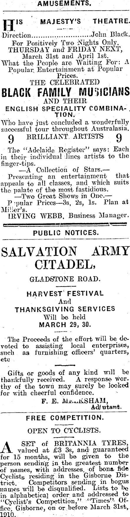 AMUSEMENTS. |JIS MAJESTY'S THEATRE. Direction John Black. For Positively Two Nights Only. THURSDAY and 1 FRIDAY NEXT, March 31st and April Ist. What the People are. Waiting For: A Popular Entertainment at Popular Price®. THE CELEBRATED BLACK FAMILY MUSICIANS AND THEIR ENGLISH SPECIALITY CGMBINA- . TION. Who have just concluded a wonderfully successful tour throughout Australasia. 0 BRILLIANT ARTISTS 0 The “Adelaide Register" says: Each in their individual lines artists to the finger-tips. —A Collection of Stars.— Presenting an entertainment that appeals to all classes, and which suits the palate of the most fastidious. —Two Great Shows in One. — P pular Prices —3s, 2s, Is. Plan at Mi tier’s-. IRVING WEBB, Business Manager. PUBLIC NOTICES. SALVATION ARMY CITADEL, GLADSTONE ROAD. HARVEST FESTIVAL And THANKSGIVING SERVICES Will be held MARCH 29, 30. The Proceeds of the effort will be devoted to assisting local enterprises, such as furnishing officers’ quarters, etc Gifts or goods of any kind will be thankfully received. A response worthy of the town may surely be looked for with cheerful confidence. F. E. AH^KSHAM, Ad/ utant. FREE COMPETITION. OPEN TO CYCLISTS. Aset of Britannia tyres, valued at £3 3s, and guaranteed for 15 months, will be given to the person sending in the greatest number of names, with addresses, of bona fide Cyclists residing in the Gisborne District-. Competitors sending in bogus names will be disqualified. Lists to be in alphabetical order and addressed to “Cyclist’s Competition," “Times" Office* Gisborne, on or before March 31st, 1910.