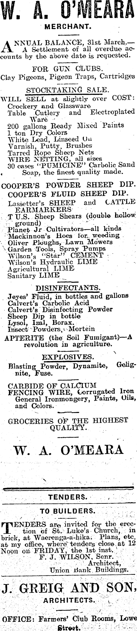W. A. O’MEARA MERCHANT. ANNUAL BALANCE, 31st March.— A Settlement of all overdue accounts by the above date is requested. FOR GUN CLUBS. Clay Pigeons, Pigeon Traps, Cartridges STOCKTAKING SALE. WILL SELL at slightly over COST: Crockery and Glassware Table Cutlery and Electroplated Ware •• 200 gallons Ready Mixed Paints 1 ton Dry Colors White Lead, Linseed On Varnish, Putty. Brushes Tarred Rope Sheep Nets WIRE NETTING, all sizes 30 oases “PUMICINE” Carbolic Sand , Soap, the finest quality made. COOPER’S POWDER SHEEP DIP. COOPER’S FLUID SHEEP DIP. Lassetter’s SHEEP and CATTLE EARMARKERS T U.S. Sheep Shears (double hollow; ground) Planet Jr Cultivators —all kinds Mackinnon’s Hoes for, weeding Oliver Ploughs, Lawn Mowers • Garden Tools, Spray Pumps Wilson’s ‘‘Star” CEMENT Wilson’s Hydraulic LIME Agricultural LIME Sanitary LIME DISINFECTANTS. Jeyes’ Fluid, in bottles and gallons Calvert’s Carbolic Acid Calvert’s Disinfecting Powder Sheep Dip in bottle Lysof, Isal, Borax. Insect' Powders,-. Mortein APTERITE (the Soil Fumigant)—A revolution in agriculture. EXPLOSIVES. Blasting Powder, Dynamite, Gelignite, Fuse. CARBIDE OF CALCIUM , , FENCING WIRE, Corrugated Iron General Ironmongery, Paints, Oils, and Colors. GROCERIES OF THE HIGHEST QUALITY. W. A. O’MEARA TENDERS. TO BUILDERS. TENDERS ane invited for the erection of St. Luke's Church, in brick, at Waerenga-a-hika. Plans, etc. at my office, where tenders close at 12 Noon on FRIDAY, the Ist inst. F. J. WILSON, Senr. Architect, Union Bank Buildings. J. GREIG AND SON, ARCHITECTS. OFFICE: Farmers’ Club Rooms, Lowe Street.-