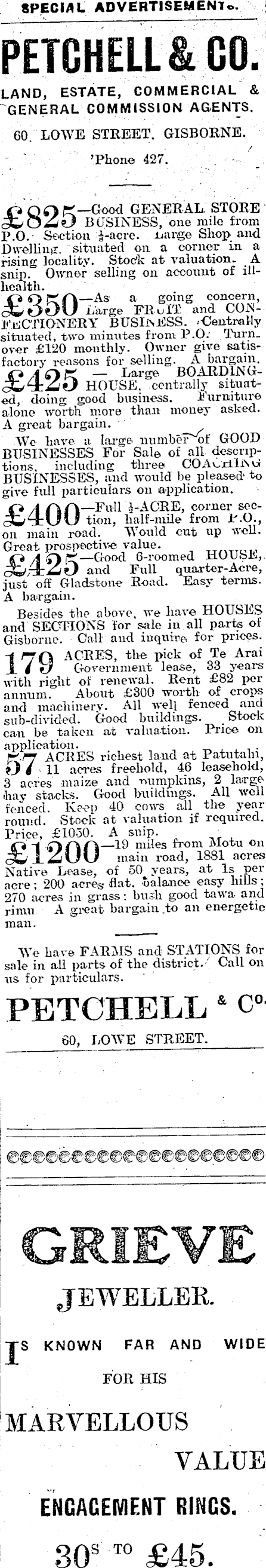SPECIAL ADVERTISEMENT*,. \ PETCHELL & GO. LAND, ESTATE, COMMERCIAL & "GENERAL COMMISSION AGENTS. 60. LOWE STREET. GISBORNE. ’Phono 427. O QOPC—'Good GENERAL. STORE BUSINESS, one mile from P.O. Section i-acre. Large Shop and Dwelling. situated oil a corner m a rising locality. Stock at valuation. A snip. Owner selling on account of illliealtli. OOK A —As a going concern, cWOOU Large FRuIT and CONFECTIONERY BUSINESS. .-Centrally situated, two minutes from P.O. Turnover £l2O monthly. Owner give satisfactory reasons for selling. A bargain. Large BOARDINGHOUSE, centrally situated, doing good business. Furniture alone worth more than money asked. A great bargain. Wc have a large number of GOOD BUSINESSES For Sale of all descriptions, including three COAc/xiliW BUSINESSES, and would be pleased to give full particulars on application. C* A A A— Full 1-ACRE, corner scction, lialf-mile from P. 0., on main road. "Would cut up well. Great prospective value. TT/ . TTC ,,. i t A ,0 ~ —Good 6-roomed HOUSE, and Full quarter-Acre, just off Gladstone Road. Easy terms. A bargain. Besides the above, we have HOUSES and SECTIONS for sale in all parts of Gisborne. Call and inquire for prices. -i rrf\ ACRES, the pick of Te Arai X 4 fj Government lease, 33 year's with right of renewal. Rent £B2 per annum. About £3OO worth of crops and machinery. All well fenced and sub-divided. Good buildings. Stock can be taken at valuation. Price on application. , _ , , . . rr'.rr ACRES richest land at Patutaln, / 11 acres freehold, 46 leasehold, 3 acres maize and mimpkins, 2 large hay stacks. Good buildings. All well fenced. Keep 40 cows all the year round. Stock at valuation if required. Price, £IOSO. A snip. A "I OOn —19 miles from Motu on <3£,- iZ U U main road, 1881 acres Native Lease, of 50 years, at Is per acre; 200 acres flat, ualance easy hills, 270 acres in grass: bush good tawa and r imu A great- bargain .to an energetic man. We have FARMS and STATIONS for sale in all parts of the district. Call on us for particulars. PETCHELL & c°60, LOWE STREET. @ee©ee®e©eee®@c©e©©€> GRIEVE JEWELLER. JS KNOWN FAR AND WIDE FOR HIS MARVELLOUS VALUE ENGAGEMENT RINGS. 30 s T 0 £45.