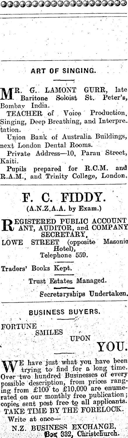 ART OF SINGING. MR. G.. LAMONT GURR, late Baritone Soloist St. Peter’s, Bombay India. TEACHER of Voice Production. Singing, Deep Breathing, and Interpretation. Union Bank of Australia. Buildings, next London Dental Rooms. Private Address —10, Parau Street, Kaiti. Pupils prepared for R.C.M. and R.A.M., and Trinity College, London, F. C. FIDDY. (A.N.Z.A.A. by Exam.) REGISTERED PUBLIC ACCOUNT ANT, AUDITOR, and COMPANY SECRETARY, LOWE STREET (opposite Masonic Hotel), Telephone 559. Traders’ Books Kept. Trust Estates Managed. Secretaryships Undertaken. BUSINESS BUYERS. FORTUNE SMILES UPON YOU. WE have just what you have been trying to 1 find for a long time. Over two hundred Businesses of every possible description, from prices ranging from £loo'to £IO,OOO are enumerated on our monthly free publication; copies sent post free to all applicants. TAKE TIME BY THE FORELOCK. Write at once-r-N.Z. BUSINESS EXCHANGE, 832, Christchurch.