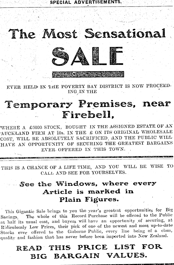 SPECIAL ADVERTISEMENTS. The Most Sensational .c; EVER HELD' IN THE POVERTY BAY DISTRICT IS NOW PROCEEDING IN THE Temporary Premises, near Fir-ebell, WHERE A £SOOO- STOCK, BOUGHT IN THE ASSIGNED ESTATE. OF AN ’AUCKLAND FIRM AT 10s. IN THE £ ON ITS ORIGINAL WHOLESALE 'COST, WILL BE ABSOLUTELY SACRIFICED. AND THE PUBLIC WILL HAVE AN OPPORTUNITY OF SECURING THE GREATEST BARGAINS EVER OFFERED IN THIS TOWN. THIS IS A CHANCE OF A LIFE TIME, AND YOU WILL BE WISE TO CALL AND SEE FOR YOURSELVES. See tlhe Windows, where every Article is marked in Plain Figures. 'i This Gigantic Sale brings to you the year’s greatest opportunities for Big Savings The -whole of this Record Purchase will be offered to the Public at half its usual cost, and buyers will have an opportunity of securing, at Ridiculously Low Prices, tlieir pick of one of the newest and most up-to-date Stocks ever offered to the Gisborne Public, every line being of a class, quality and fashion that has never before been imported into New Zealand. READ THIS PRICE LIST FOR. BIG BARGAIN VALUES.