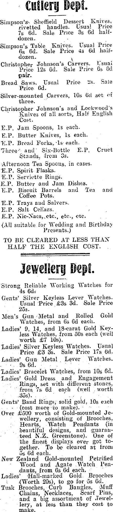 ’Simpson's-' Sheffield Dessert Knives, rivetted handles. Usual Price 7s 6d. Sale Price 3s 6d halfdozen. Simpson’s Table Knives. Usual Price 6 S 6d. Sale Price 4s 6d halfdozen. v Christopher Johnson’s Carvers, Lsuai Price 12s 6d. Sale Price 6s 8d pair. Bread Saws. Usual Price 2s. Sale Price 6d. Silver-mounted Carvers, 10s Gel set of three. Christopher Johnson's and Lockwood's Knives of all sorts, Half English Cost. E.P. Jam Spoons. Is each. E.P. Butter Knives, Is each. E.P. Bread Forks, ‘ls each. Three' and Six-Bottle E.P. Cruet Stands, from 3s. •Afternoon Tea Spoons, in casesE.P. Spirit Flasks. E.P. Serviette Rings. E.P. Butter and Jam Dishes. E.P. Biscuit Barrels and Tea and Coffee Pots. E.P. Trays aud Salvers. E.P. Salt Celiars. / E.P. Nic-Xacs,.etc., etc., etc. (All suitable for Wedding and Birthday Presents.) TO BE CLEARED AT LESS THAN HALF THE ENGLISH COST. Jewellery Dept. Strong Reliable Working Watches for 4s 6di Cents’ Silver Keyless Lever Watches. Usual Price £3s 3d. Sale Price 255. Men’s Gun Metal and Rolled Gold Watches, from 6s 6d each. Ladies’ 9, 14, and 18-carat Gold Keyless Watches, from 50s each (well worth £7 10s). Ladies’ Silver Keyless Watches, Usual Price £3 3s, Sale Price 17s 6d. Ladies’ Gun Metal Lever Watches. 9s 6d. Ladies’ Bracelet Watches, from 10s 6d. Ladies’ Gold Dress and Engagement Rings, set with different stones, from 7s 6d each (well worth 355). Gents’ Band Rings, solid gold, 10s each (cost more to make). Over £SOO worth of Gold-mounted Jewellery, consisting of Brooches, Hearts, Watch Pendants (in beautiful designs, and guaranteed N.Z. Greenstone). One of the finest displays ever got together. To lx> cleared at from 5s Cd each. New Zealand Gold-mounted Petrified Wood and Agate Watch Pendants, from 6s 6d each. Ladies’ Hall-marked Gold Brooches (Worth 20s), to go for 5s Gd. Tusk Brooches, Curb Bangles, Muff Chains, Necklaces, Scarf Pins, and a big assortment of Jewellery, at less than they cost to make.