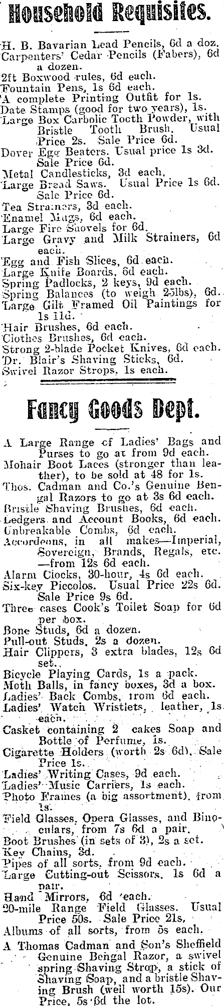 HrasetoM K€«siiisil®s. H. B. Bavarian Ijcad Pencils, 6d a doz. Carpenters' Cedar Pencils (Fabers), Gd a dozen. 2ft Boxwood rules, Gd eacli. 'Fountain Pens, Is Gd each. 'A complete Printing Outfit for Is. Pate Stamps (good for two years), Is. Large Box Carbolic Toctli Powder, with Bristle Tooth Brush. Usual Price 2s. Sale Price Gd. Dover Egq Beaters. Usual price Is 3d. Sale Price Gd. Metal Candlesticks, 3d each. Large Bread Saws. Usual Price Is Gd. Sale Price Gd. Tea Stra:ners, 3d each. Enamel Mugs. Gd each. Large Fire Shovels for Gd. Large Gravy and Milk Strainers, Cd each. ’Egg and Fish Slices, 6d each. Large Knife Boards, 6d each. Spring Padlocks, 2 keys, 9d each. Spring Balances (to weigh 2dlbs>, Gd., Large Gilt Framed Oil Paintings foils llu. Hair Brushes, Gd each. Clothes Brushes, Gd each. Strong 2-blade Pocket Knives, Gd each. 'Dr. Blair's Shaving Sticks, Gd. Swivel Razor Strops, Is each. Foßcy Oosds Dept. A Large Range cf Ladies' Bags and Purses to go at from 9d each. Mohair Boot Laces (stronger than leather), to be sold at 48 for Is. Thos. Cadman and Co.’s Genuine Bengal Razors to go at 3s 6d each. Bristle Shaving Brushes, Gd each. Ledgers and Account Books, Gd each. Unbreakable Combs, Gd each. Aecordeons, in all makes—lmperial, Sovereign, Brands, Regals, etc. —from 12s 6d each. Alarm Clocks, 30-hour, 4s Gd each. Six-key Piccolos. Usual Price 22s 6d. Sale Price 9s 6d. Three eases Cook’s Toilet Soap for Gd per ibox. Bone Studs, Gd a dozen. Pull-out Studs, 2s a dozen. Hair Clippers, 3 extra blades, 12r Gd set., Bicycle Playing Cards, Is a pack. Moth Balls, in fancy boxes, 3d a box. Ladies’ Back Combs, irom Gd each. Ladies’ Watch Wristlets, leather, Is each. Casket containing 2 cakes Soap and Bottle of Perfume, Is. Cigarette Holders (worth 2s 6d). Sale Price Is. Ladies’ Writing Cases, 9d each. Ladies’ Music Carriers, Is each. Photo Frames (a big assortment), from. Is. Field Glasses. Opera Glasses, and Bingen iars, from 7s 6cl a pair. ' Boot Brushes (in sets of 3), 2s a sot. Key Chains, 3d. Pipes of all sorts, from 9d each. Large Cutting-out Scissors. Is Gd a pair. Hand Mirrors, 6d 'each. 20-mile Range Field Glasses. Usual Price 50s. Sale Price 21s, Albums of all sorts, from os each. A Thomas Cadman and Son’s Sheffield Genuine Bengal Razor, a swivel spring Shaving Strop, a stick of Shaving Soap, and a bristle Shaving Brush (well worth 15s). Our Price, ss'Gd the lot.