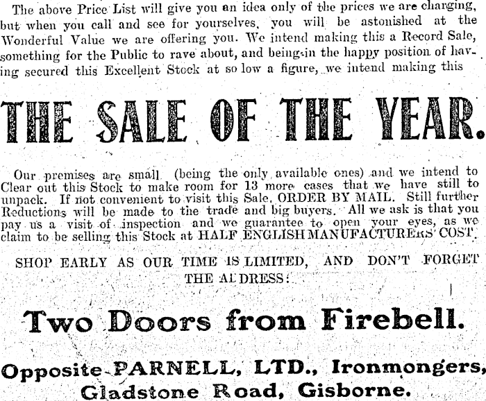 The above Price List will give you an idea only of the prices we are charging, but when you call and see for yourselves, you will be astonished at the Wonderful' Value we are offering you. We intend making this a Record Sale, something for the Public to rave about, and beingdn the happy position, of hav. ing secured this Excellent Stock at so low a figure, we intend making tins Our promises are small (being the only available ones) ancl we intend to Clear out this Stock to make room for 13 more cases that w e have still to unpack. If Pot convenient to visit this Sale, ORDER BY MAIL. Still further Reductions will be made to the trade and big buyers. All we ask is that you pay us a visit of inspection and we guarantee to open your eyes, as we claim to be selling this Stock at HALF ENGLISH MAN UFACTUREieS COSI. SHOP EARLY AS OUR TIME IS LIMITED, AND DON’T FORGET v . A,' the Ai;DRESS: Two Opposite PARNELL, LTD., Ironmongers, Gladstone Road, Gisborne.