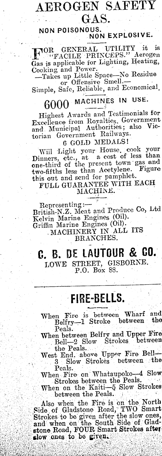 AEROGEN SAFETY GAS. NON POISONOUS. NON EXPLOSIVE. FOR GENERAL UTILITY it is ‘ ‘FACILE PRINCEPS. ’’ Aerogen Gas is applicable for Lighting, Heating, Cooking and Power. _ Takes np Little Space—No Residue or Offensive Smell.— Simple, Safe, Reliable, and Economical. 6000 machines in use. Highest Awards and Testimonials for Excellence from Royalties. Government and Municipal Authorities; also Victorian Government Railways. 6 GOLD MEDALS! AYiil Light your House, cook your Dinners, etc., at a- cost of less than one-third of the present town gas and two-fifths less than Acetylene Figure this out and send for pamphlet. FULL GUARANTEE WITH EACH MACHINE. Representing■ - n ~ , British-N.Z. Meat and Produce Co-, Ltd Kelvin Marine Engines (Oil). Griffin Marine Engines (Oil). MACHINERY IN ALL ITS BRANCHES. C. B. BE LAUTOUR & CO. LOWE STREET, GISBORNE. P.O. Box 88. FIRE-BELLS. When Fire is between Wharf and Belfry—l Stroke between the als • When between Belfry and Upper Fire Bell—2 Slow Strokes between PfifliiS* West End. above Upper Fire Bell—--3 Slow Strokes between the When Fire on Whataupoko-r-4 Slow Strokes between the Peals. When on the Kaiti—§ Slow Strokes between the Peals. Also when the Fire is on the North Side of Gladstone Road, TWO Smart Strokes to be given after the slow ones, and when on the South Side of Gladstone Road, FOUR; Smart Strokes aftei slow ones to be given*