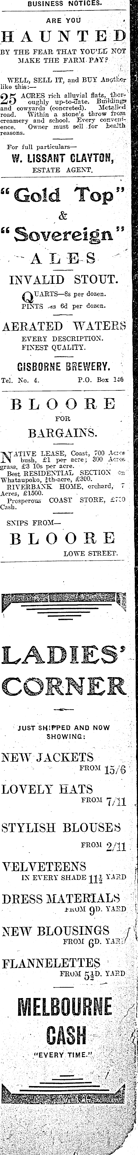 BUSINESS NOTICES. ARE YOU HAUNTED BY THE FEAR THAT YOU’LL NOT MAKE THE FARM PAY? WELL, SELL IT, and BUY Another like this:— 2£7 ACRES rich alluvial flats, thorts oughly up-to-date. Buildings and cowyarda (concreted). Metalled road. Within a stone’s throw from creamery and school. Every convenience. Owner must sell for health reasons. For full particulars — W. LISSANT CLAYTON, ESTATE AGENT. “ Gold Top” & “ Sovereign ” .'ALES ' INVALID STOUT. —Bs per dozen. PINTS -ts 6d per dozen. AERATED WATERS EVERY DESCRIPTION. FINEST QUALITY. GiSBORNE BREWERY. Tel. No. 4. P.O. Box 246 BLOORE FOR BARGAINS. NATIVE LEASE, Coast, 700 Acres bush, £T per acre; 300 Acre* "rass £3 10s per acre. “ Best RESIDENTIAL SECTION on Wliataupoko, |th-acre, £3OO. RIVER-BANK HOME, orchard, 7 Acres, £ISOO. Prosperous COAST STORE, £<-0 Cash. SNIPS FROM—BLOORE LOWE STREET. LADIES’ CORNER JUST SHIPPED AND NOW SHOWING: NEW JACKETS from 15/ g LOVELY HATS FROM 7/11 STYLISH BLOUSES FROM 9/11 VELVETEENS IX EVERY SHADE YARD DRESS MATERIALS from QD. YARD NEW BLOUSINGS FROM OD. YAH:/ FLANNELETTES FROM gjb. YARD MELBOURNE ‘'EVERY TIME.” ■