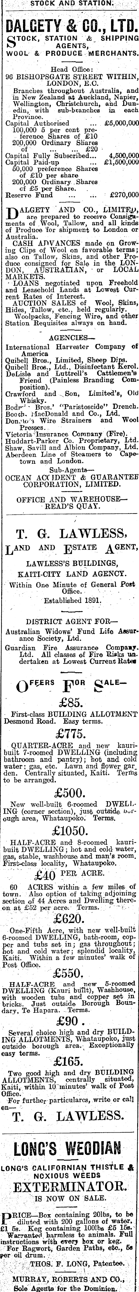 STOCK AND STATION. DALGETY & GO., LTD. STOCK, STATION & SHIPPING AGENTS, WOOL & PRODUCE MERCHANTS. Head Office: 96 BISHOPSGATE STREET WITHIN, LONDON, E.O. Brandies throughout Australia, and in New Zealand at Auckland, Napier, Wellington, Christchurch, and Dunedin, with sub-branches in each Province. Capital Authorised ... £5,000,0U0 100,000 5 per cent preference Shares of £lO 200,000 Ordinary Shares of £2O Capital Fully Subscribed... 4,500,000 Capital Paid-up ... £1,600,000 50,000 preference Shares of £lO per share 200,000 Ordinary Shares cf £5 per Share. Reserve Fund ... ... £270,000 DALGETY AND CO., LIMITER, are prepared to reoeive Consignments of Wool, Tallow, and all kinds of Produce for shipment to London or Aiisf.rfl.li3!. CASH ADVANCES made on Growing Clips of Wool on favorable terms; also on Tallow. Skins, and other Produce consigned for Sal© in the LONDON, AUSTRALIAN, or LOCAL MARKETS. • LOANS negotiated upon Freehold and Leasehold Lands at Lowest Current Rates of Interest. AUCTION SALES of Wool, S'kins, Hides, Tallow, etc., held regularly. Woolpacks, Fencing Wire, and other Station Requisites always on hand. AGENCIES— International Harvester Company of America Quibell Bros., Limited, Sheep Dips. Quibell Bros., Ltd., Disinfectant Kerol. DeLisle and Luttrell’s Cattlemen's Friend (Painless Branding Composition). Crawford and Son, Limited’s, Old Whisky. Bodr-'' Bros.’ “Paristoscide” Drench. Booth. MacDonald and Co., Ltd. Don.no s Wire Strainers and Wool Presses. Victoria'.lnsurance Company (Fire). Hnddart-Parker Co. Proprietary, Ltd. Shaw, Savill and Albion Company, Ltd. Aberdeen Line of Steamers to Capetown and London. Sub-A gents— OCEAN ACCIDENT & GUARANTEE CORPORATION, LIMITED. OFFICE AND WAREHOUSEREAD’S QUAY. T. G. LAWLESS, AND J}STATE LAWLESS’S BUILDINGS, KAITI-CITY LAND AGENCY. Within One Minute of General Post Office. Established 1891. DISTRICT AGENT FORrAustralian Widows’ Fund Life Assurance Society, Ltd. Guardian Fire Assurance Company. Ltd. All classes of Fire Risks undertaken at Lowest Current Rateo OF£ERS JjlOR gALE—£BS. First-class BUILDING ALLOTMUNT Desmond Road. Easy terms. £775. QUARTER-ACRE and new kauribuilt 7-roomed DWELLING (including bathroom and pantry); hot and cold water; gas, etc. Lawn and flower gar_ den. Centrally situated, Kaiti. Terms to be arranged. £SOO. New well-built 6-roomed DWELLING (corner section), just outside, trough. area, Whataupoko. Terms. £IOSO. HALF-ACRE and 8-roomed kaurimilt DWELLING; hot and cold water, ;as, stable, washhouse and man’s room, ftrst-class locality, Whataupoko. PER ACRE. £4O 60 ACRES within- a few miles of town. Also option of taking adjoining section of 44 Acres and Dwelling thereon at £52 per acre. Terms. ' ' ■ £620. One-Fifth Acre, with new well-built 6-roomed DWELLING, bath-room copper and tubs set in; gas throughout; hot and cold water; splendid locality, Kaiti. Within a few minutes’ walk of Post Office. £550. HALF-ACRE and new 5-roomed DWELLING (Kauri built), Washhouse, with wooden tubs and copper set in bricks. Just outside Borough. Boundary, Te Hapara. Terms. £9O. Several choice high and dry BUILDING ALLOTMENTS, Whataupoko, just outside boiough area. Exceptionally easy terms. £165. Two good high and dry BUILDING ALLOTMENTS, centrally situated, Kaiti, within 10 minutes’ walk of Post Office. For further particularcs, write or call on— T. G. LAWLESS. LONG’S JpDIAM LONG’S CALIFORNIAN THISTLE & NOXIOUS WEEDS EXTERMINATOR. IS NOW ON SALE. PRICE —Box containing 201 bs, to be diluted with 200 gallons of water, £1 ss. Keg containing lOOlbs £6 16a.' Warranted harmless to animals. Full instructions with every box or keg. For Ragwort, Garden Paths, etc., Be per oil drum. . THOS. F. LONG, Patentee. . ■ MURRAY, ROBERTS AND CO., Sole Agents for the Dominion. r