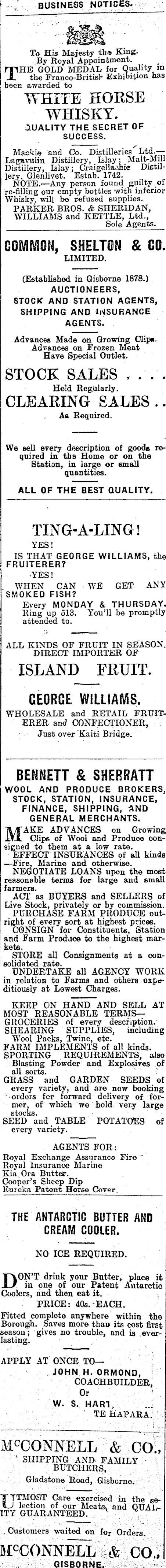 business notices. To His Majesty the King. By Royal Appointment. THE GOLD MEDAL for Quality in the Franco-British Exhibition has been awarded to WHITE HORSE WHISKY. DUALITY THE SECRET OF SUCCESS. Mackie and Co. Distilleries Ltd.— Lagavulin Distillery, Islay; Malt-Mill Distillery, Islay; Craigellaohic Difitillery, Glenlivet. Estab. 1742. NOTE. —Any person found guilty of re-filling our empty bottles with inferior Whisky will be refused supplies. PARKER BROS. & SHERIDAN, WILLIAMS and KETTLE, Ltd., Sole Agents. COMMON, SHELTON & CO. LIMITED. (Established in Gisborne 1878.) AUCTIONEERS, STOCK AND STATION AGENTS, SHIPPING AND INSURANCE AGENTS. Advances Made on Growing Clips. Advances on Frozen Meat Have Special Outlet. STOCK SALES . . . . Held Regularly. CLEARING SALES .. As Required. We sell every description of good* required in tie Home or on the Station, in large or email quantities. ALL OF THE BEST QUALITY. TING-A-LINGM YES! IS THAT GEORGE WILLIAMS, the FRUITERER? ■YES! WHEN CAN WE GET ANY SMOKED FISH? Every MONDAY & THURSDAY. Ring up 513. You'll be promptly attended tc. ALL KINDS OF FRUIT IN SEASON. DIRECT IMPORTER OF ISLAND FRUIT. GEORGE WILLIAMS. WHOLESALE and RETAIL FRUITERER and CONFECTIONER, Just over Kaiti Bridge. BENNETT & SHERRATT WOOL AND PRODUCE BROKERS, STOCK, STATION, INSURANCE, FINANCE, SHIPPING, AND GENERAL MERCHANTS. MAKE ADVANCES on Growing Clips of Wool and Produce consigned to them at a low rate. EFFECT INSURANCES of all kinds —Fire, Marine and otherwise. NEGOTIATE LOANS upon the most reasonable terms for large and small farmers. ACT as BUYERS and SELLERS of Live Stock, privately or by commission. PURCHASE FARM PRODUCE outright of every sort at highest prices. CONSIGN for Constituent*, Station and Farm Produce to the highest markets. STORE all Consignments at a concel i/j n j/yl rof a UNDERTAKE all AGENCY WORK in relation to Farms and others expeditiously at Lowest Charges. KEEP ON HAND AND SELL AT MOST REASONABLE TERMS—GROCERIES of every description. SHEARING SUPPLIES, including Wool Packs, Twine, etc. FARM IMPLEMENTS of all kinds. SPORTING REQUIREMENTS, also Blasting Powder and Explosives of all sorts. GRASS and GARDEN SEEDS of every variety, and are now booking orders for forward delivery of former. of which we hold very large Rtookfl SEED and TABLE POTATOES of every variety. AGENTS FOR: Royal Exchange Assurance Fire Royal insurance Marine Kia Ora Butteir. Cooper’s Sheep Dip Eureka Patent Horse Cover. THE ANTARCTIC BUTTER AND CREAM COOLER. NO ICE REQUIRED. DON’T drink your Butter, place it in one of our Patent Antarctic Coolers, and then eat it. PRICE: 40s. EACH. Fitted complete anywhere within the Borough. Saves more than its cost first season; gives no trouble, and is everlasting. APPLY AT ONCE TO—JOHN H. ORMOND, COACHBUILDER, Or W. S. HART. TE HaPARA. M c CO.NNELL & C< SHIPPING AND FAMILY BUTCHERS, Gladstone Road, Gisborne. T TTMOST Care exercised in the U lection of our Meats, and QL ITY GUARANTEED. Customers waited on for Orders. M c CONNELL & CO., GISBORNE.