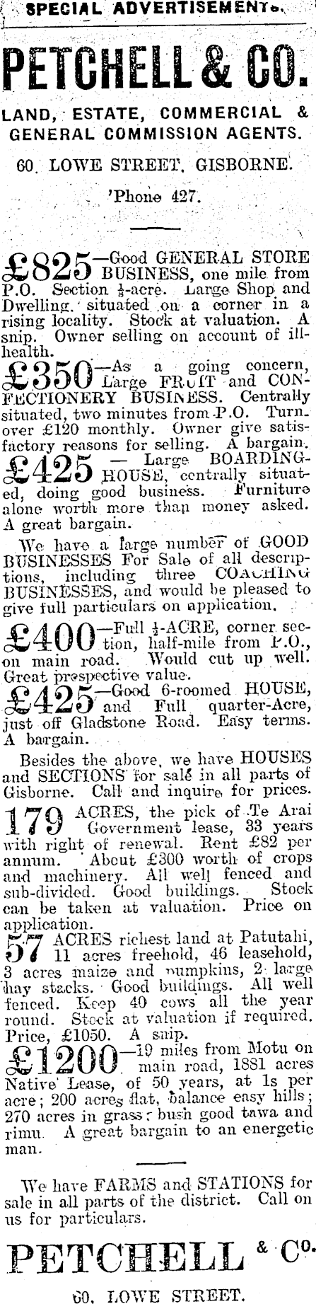 SPECIAL ADVERTISEMENT*. PETCHELL&CO. LAND, ESTATE, COMMERCIAL & GENERAL COMMISSION AGENTS. 60. LOWE STREET, GISBORNE. . ’Phone 427. £B2s’ —Good GENERAL STORE BUSINESS, one mile from P.O. Section £-acre. juange Shop and Dwelling, situated on a corner in a rising locality. Stock at valuation. A snip. Owner selling on account of illhealth. UOK A—As a going concern, dWuDU Large FRuIT and CONFECTIONERY BUSINESS. Centrally situated, two minutes from-P.O. Turn, over £l2O monthly. Owner give satisfactory reasons for selling. A bargain. A O Large BOARDINGHOUSE, centrally situated, doing good business. Furniture alone worth more than money asked. A great bargain. We have a large number of GOOD BUSINESSES For Sale of all descriptions, including three COiWilliMA BUSINESSES, and would be pleased to give full particulars on application. O A A A—Full $-ACRE, corner section, half-mile from P. 0., on main road. Would cut up well. Great prospective value. A O —Good 6-roomed HOUSE, cW'4and Full quarter- Acre, just off Gladstone Road. Easy terms. A bargain. Besides the above, we have HOUSES and SECTIONS’ for sail in all parts of Gisborne. Call and inquire for priees. i rj(\ ACRES, the pick of -Te Arai lit/ Government lease, 33 years with right of renewal. Rent £B2 per annum. ’ About £3OO worth of crops and machinery. Ail well fenced and sub-divkled. Good buildings. Stock can be taken at valuation. Price on application. ACRES richest laud at Patutalu, O 4 11 acres freehold, 46 leasehold, 3 acres maize and mimpkins, 2 large ’hay stacks. Good buildings. All well fenced. Keep 40 cows all the year round. Stock at valuation if required. Price, £IOSO. A snip, rb qj nAA-ii) miles from Motu on aW JLiwU'U main road, 1881 acres Native’ Lease, of 50 years, at Is per acre; 200 acres flat, balance easy hills; 270 acres in grass r bush good tawa and rimu. A great bargain to an energetic man. We have FARMS and STATIONS for sale in all parts of the district. Call on us for particulars. PETCHELL & c°00, LOWE STREET.
