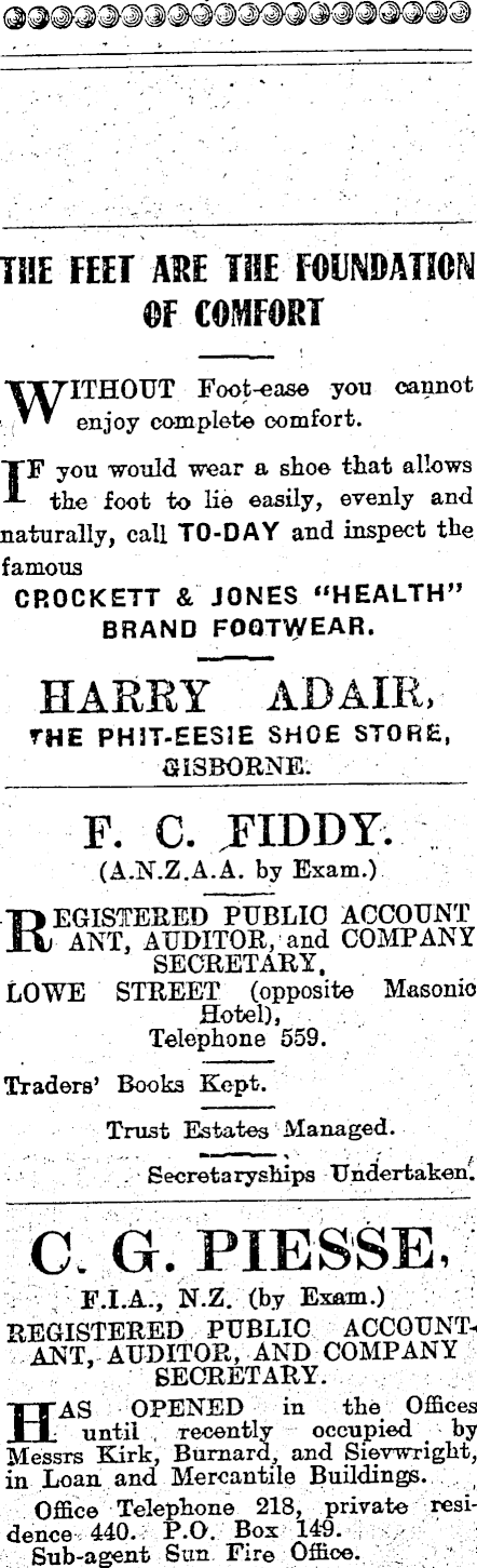 THE FEET ARE THE FOUNDATION OF COMFORT WITHOUT Foot-ease you cannot enjoy complete comfort. IF you would wear a shoe that allows the foot to lie easily, evenly and naturally, call TO-DAY and inspect the famous CROCKETT & JONES “HEALTH” BRAND FOOTWEAR. HARRY ADAIR, the PHJT-EESIE SHOE STORE, GI3BORNE. F. C. FIDDY. (A.N.Z.A.A. by Exam.) ACCOUNT ANT, AUDITOR, and COMPANY SECRETARY, LOWE STREET (opposite Masonic Hotel), Telephone 559. Traders’ Books Kept. Trust Estates Managed. Secretaryships Undertaken. C. G. PIES'SE, F.1.A., N.Z. (by Exam.) REGISTERED PUBLIC ACCOUNTANT, AUDITOR, AND COMPANY SECRETARY. HAS OPENED in the Offices until , recently occupied by Messrs Kirk, Barnard, and Sievwright, in Loan and Mercantile Buildings. Office Telephone 218, private residence 440. P.O. Box 149. Sub-agent Sun Fire Office.