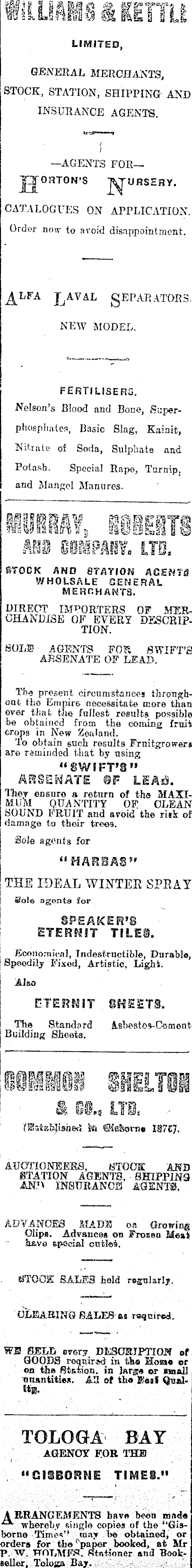 LIMITED, & if! GENERAL MERCHANTS, STOCK, STATION, SHIPPING AND INSURANCE AGENTS. —AGENTS FOR—JJOHTON’S J^URSEBY. CATALOGUES ON APPLICATION. Order nnvr to avoid disappointment. A LFA L AVAL SEPARATORS. NEW MODEL. FERTILISERS, Nelson’s Blood and Bone, Superphosphates, Basic Slag, Kainit, Nitrate of Soda, Sulphate and Potash. Special Rape, Turnip, and Mangel Manures. lITI . X. 5 STOCK AND STATION AGENTS WHOLSALE GENERAL MERCHANTS. DIRECT IMPORTERS OF MERCHANDISE OF EVERY DESCRIPTION. SOLD AGENTS FOR SWIFT’S ARSENATE OF LEAD. The present circumstances throughout the Empire necessitate more than over that the fullest results possible be obtained from the coming fruit crops in Now Zealand. To obtain such results Fruitgrowers aro reminded that by using “swsft’S" ARSENATE fir LiAsS. They ensure a return of the MAXIMUM QUANTITY OF CLEAN BOUND FRUIT and avoid the risk of damage to their trees. Sole agents for “ H ARB A8 59 THE IDEAL WINTER SPRAY Sole agents for SPEAKER’S ETERiNiST TILES. Economical, Indestructible, Durable, Speedily Fixed, Artistic, Light. Also ETERNIT SHEETS. The Standard Asbestos-Cement Building Sheets. fits 18 WMMBR IHiITON & G@, s LIS. ISaiaMisaed ia ©fe&orns IW'fC]. AUCTIONEERS, STOCK AND STATION AGENTS, SHIPPING AND INSURANCE AGENTS. ADVANCES MAD3S oa Growing Clips. Advances on Froaen Meat have apociffll outlet. (UTGOJE SALES hold regularly. CLEARING SALES-as required. WS SELL every DESCRIPTION of GOODS required! in th© Homo or on the Station, in large or esaail tmantities. AT of tho Steal QumlTOLOGA BAY AGENCY FOR 'THE “GISBORNE TIMES." A RRANG FOMENTS have been made A whereby single copies of the “Gisborne Times” may be obtained, or orders for the ' paper booked, at Mr P. W. HOLMES. Stationer and Bookseller, Toloaa Bay.