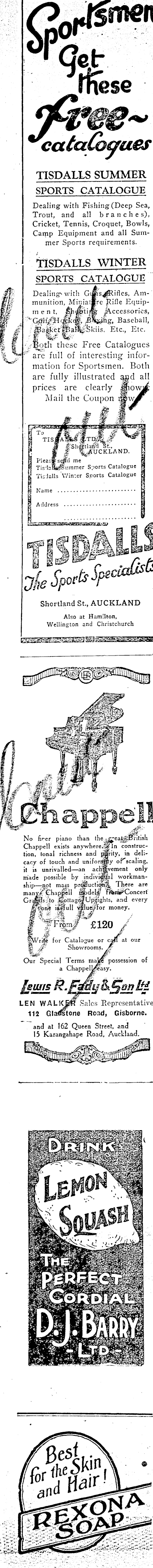 id rnese *'catctCo^ues TISDALLS SUMMER SPORTS CATALOGUE Dealing with Fishing (Deep Sea, Trout, and all branches), Cricket, Tennis, Croquet, Bowls, Camp Equipment and all Summer Sports requirements. TISDALLS WINTER SPORTS CATALOGUE Dealing'with Ammunition, Miniature Rifle Equipment, $h §ti Me Accessories, cMIM, ,B%iftg, Baseball, JPask'etjp Etc., Etc. ■ f %' t these Free Catalogues are full of interesting information for Sportsmen. Both are fully illustrated agd all prices are clearly Wkovfm Mail the Coupon i m\vjp f fSh<ftl3sl St., § jf I^CKLAND. Pleas® sapd me Tis'la9si!?£ ; umner Sports Catalogue Tis.lalls Winter Sports Catalogue Name Address sirs my lLSpovts^ cii Shortland St, AUCKLAND Also at Hamilton, Wellington and Christchurch No firer piano than the Chappell exists anywhere/pln construction, tonal richness and Minty, in delicacy of touch and uniformity oFscaling, it is unrivalled—an achavement only made possible by indiviaffal workmanship— rnot mass pri)l!ucti<|n|L There are many/ Chappell ifflbdel# Graph to j^ottagwUprights, and every fjjjyiprii isjfull money. f ' " £l2O y vWrifi for Catalogue or ciyfl at our S Showrooms. £ ' £ ■ , Our Special Terms make possession of a Chappelbfeasy. feuiis LEN WALKjpSf Sales Representative 112 Glatretone Read, Gisborne. and at 162 Queen Street, and 15 Karangahape Road, Auckland. m Ft I for dH* r an