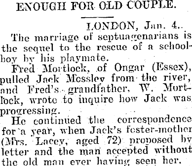 ENOUGH FOR OLD COUPLE. LONDON, Jan. 4.. The marriage of septuagenarians is the sequel to the rescue of a schoolbov bv bis playmate. Fred Mortlock, of Ongar (Essex), pulled Jack Mcsslev from the river, and Fred’s grandfather, W. Murtlock, wrote to inquire how Jack was. progressing. He continued the correspondence for a year, when Jack’s foster-mother (Mbs. Lacev, aged 72) iiroposed by letter and the man accepted without the old man ever having seen her.