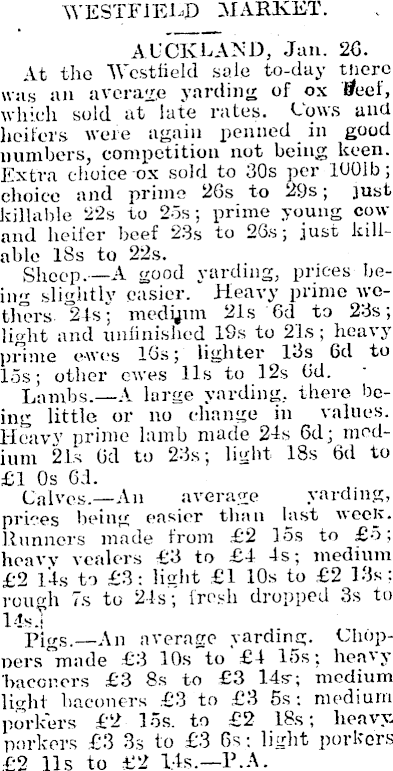 WESTFIELD MARKET. AUCKLAND, Jan. 26. At the Westfield sale to-day tnere was an average yarding of ox ffeet, which sold at late rates. Lows and heifers were again penned in good numbers, competition not being keen. Extra choice-ox sold to 30s per lUOib; choice and prime 26s to 295; just killable 22s to 255; prime young cow and heifer beef 23s to 265; just killable 18s to 225. Sheep.—A good yarding, prices being slightly easier. ‘ Heavy prime wctliors 245; lnedyun 21s 6d to 235; light and unfinished 19s to 21s; heavy prime ewes 16s; lighter 13s 6d to 15s; other ewes 11s to 12s Od. Lambs.—A large yarding, there being little or no change in values. Heavy prime lamb made 24s 6d; medium 2ls Gel to 235; light 18s 6d to £1 0s 6:1. Calves. —An average yarding, prices being easier than last weeK. Runners made from £2 los to £•>; heavy vealors £3 to £4- 4s ; medium £2 14s to £3: light £1 10s to £2 18s: rough 7.s to 245; fresh dropped 3s to Us? Pigs.—An average yarding. Choppers made £3 10s to £4 15s; heavy baconors £3 8s to £3 14s-; medium lio-ht haconers £3 to £3 ss; medium porkers £2 15s. to £2 18s; heavy porkers £3 3s to £3 6s; light porkers £2 11s to £2 1.45. P.A.