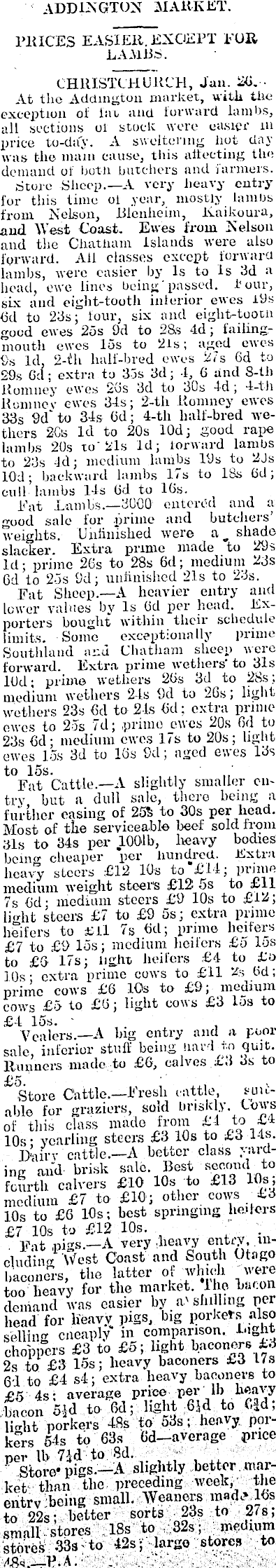 ADDINGTON MARKET. PRICES EASIER, EXCEPT FOR LAMBS. CHRISTCHURCH, Jan. 26. • At the Addington market, with the exception of iai and forward lambs, all sections ol stock were easier m price to-day. A sweltering hot day was the mam cause, this affecting the demand ol both butchers and farmers. Store Sheep.—A very heavy entry for this time ol year, mostly lambs from Nelson, Blenheim, Kaikoura, and West Coast. Ewes from Nelson and the Chatham islands were also forward. Ail classes except forward lambs, were easier by Is to is ,3d a head, ewe lines being passed, flour, six and eight-tooth interior ewes i9s 6d to 235; lour, six and eiglit-toocn good ewes 25s 9d to 28s 4d; failingmouth ewes 15s to 21s; aged ewes 9s Id, 2-tli half-bred ewes 2 i s 6d to 29s Gel; extra to 35s 3d; 4, 6 and S-tb Romney ewes 26s 3d to 30s 4d ; 4.-th Romnev ewes 345; 2-tli Romney ewes 33s 9d* to 34s 0d; 4-tli half-bred wethers 2€’s Id to 20s lOd; good rape lambs 20s to'2ls Id; iorward lambs to 23s -Id; medium lambs 19s to 2Js lOd; backward lambs 17s to 18s (id; cull lambs 14s 0d to 10s. fl’at Lambs.—Booo entered and a good sale for prime and butchers' weights. Unfinished were shade slacker. Extra prime made to 29s Id; prime 26s to 28s 6d; medium 23s Gd to 25s 9d; unfinished 21s to 235. Fat Sheep.—A heavier entry and lower values by Is Od per head. Exporters bought within their schedule limits. Some exceptionally prime Southland and Chatham sheep were forward. Extra prime wethers'to 31s lOd; prime wethers 20s 3d to 28s; medium wethers 24s 9cl to 20s; light wethers 23s 6d to 24s Od; extra prime ewes to 25s 7d; prime ewes 20s fid to 23s fid; medium ewes 17s to 20s; light ewes los 3d to 10s 9(1; aged ewes 13s to 15s. Fat Cattle—A slightly smaller entry but a dull sale, there being a further easing of 25S to 30s per head. Most of the serviceable beef sold from 3ls to 34s per 1001 b, heavy bodies bem <>• cheaper per hundred. Extra heavy steers £l2 10s to £l4; prime medium weight steers £l2- 5s to £ll 7s Od; medium steers £9 10s to £l2; li'dit steers £7 to £9 ss; extra prime heifers to £ll 7s <xl; prime heifers £7 to £9 los; medium heitcrs £5 los to £6 17s; light heifers £4 to £o 10s; extra prime cows to £ll 2s Gd; prime cows £6 10s to £9; medium cows £5 to £0; light cows £3 los to £4 15s. Venters. —A big entry and a poor sale, inferior stuff being hard to quit. Runners made to £O, calves.£3 os to £ Store Cattle.—Fresh cattle, suitable for graziers, sold briskly Lows of this class made from £1 to £4 10s- yearling steers £3 10s to £3 14s. Dairy cattle.—A better class yarding and brisk sale Best second to fourth calvers £lO 10s to £l3 10s, medium £7 to £loj other cows £3 10s to £0 10s; best springing lie.*lcis £7 10s to £l2 10s. Fat pigs.—A very heavy entry, including West Coast and South Otago baconors, the latter of which were too heavy for the market, iho bacon demand was easier by a'shilling per head for heavy pigs, big porkers also selling cheaply in comparison. Light choppers £3 to £5; light baconors £3 2s to £3 los; heavy haconers £3 17s 6d to £4 s 4; extra heavy haconers to £5 4s • average price per lb heavy /bacon sjd to Gd / light 6Jd to Cfd; lio-ht porkers 48s to 535; heavy polked 54s to 63s fid—average price per lb 7-jd to Bd. Store* pigs.—A slightly better market than the preceding week, the entry being small. Meaners made* lbs to 225; better sorts 23s to 2/s, small stores 18s to 325; medium stores 33s to 425; largo stores to 48s.—P.A.