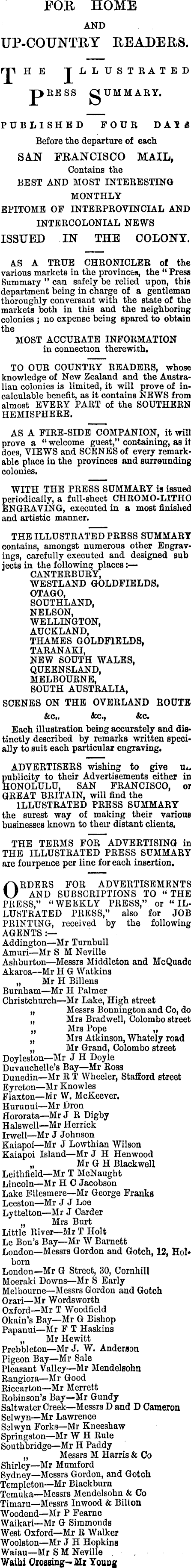 EOR HOME AND UP-COUNTRY HEADERS. JLLUSTRATED pRESS gUMMARY. PUBLISHED FOUR DAYS Before the departure of each SA.N FRANCISCO MAIL, Contains the BEST AND MOST INTERESTING MONTHLY EPITOME OF INTERPROYINCIAL AND INTERCOLONIAL NEWS ISSUED IN THE COLONY. AS A TRUE CHRONICLER of the various markets in the provinces, the “ Press Summary ” can safely be relied upon, this department being in charge of a gentleman thoroughly conversant with the state of the markets both in this and the neighboring colonies ; no expense being spared to obtain the MOST ACCURATE INFORMATION in connection therewith. TO OUR COUNTRY READERS, whose knowledge of New Zealand and the Australian colonies is limited, it will prove of incalculable benefit, as it contains NEWS from almost EVERY PART of the SOUTHERN HEMISPHERE. AS A FIRE-SIDE COMPANION, it will prove a “ welcome guest,” containing, as it does, VIEWS and SCENES of every remarkable place in the provinces and surrounding colonies. WITH THE PRESS SUMMARY is issued periodically, a full-sheet CHROMO-LITHO ENGRAVING, executed in a most finished and artistic manner. THE ILLUSTRATED PRESS SUMMARY contains, amongst numerous other Engravings, carefully executed and designed sub iects in the following places:— CANTERBURY, WESTLAND GOLDFIELDS, OTAGO, SOUTHLAND, NELSON, WELLINGTON, AUCKLAND, THAMES GOLDFIELDS, TARANAKI, NEW SOUTH WALES, QUEENSLAND, MELBOURNE, SOUTH AUSTRALIA, SCENES ON THE OVERLAND ROUTE Ac.. Ac., Ac. Bach illustration being accurately and distinctly described by remarks written specially to suit each particular engraving. ADVERTISERS wishing to give Un publicity to their Advertisements either in HONOLULU, SAN FRANCISCO, or GREAT BRITAIN, will find the ILLUSTRATED PRESS SUMMARY the surest way of making their various businesses known to their distant clients, THE TERMS FOR ADVERTISING in THE ILLUSTRATED PRESS SUMMARY are fourpence per line for each insertion. ORDERS FOR ADVERTISEMENTS AND SUBSCRIPTIONS TO “THE PRESS,” “WEEKLY PRESS,” or “ILLUSTRATED PRESS,” also for JOB PRINTING, received by the following AGENTS : Addington—Mr Turnbull Amuri—Mr S M Neville Ashburton —Messrs Middleton and McQuade Akaroa —Mr H G Watkins „ Mr H Billens Burnham —Mr H Palmer Christchurch —Mr Lake, High street „ Messrs Bonnington and Co, do „ Mrs Brad well, Colombo street ~ Mrs Pope „ „ Mrs Atkinson, Whately road ~ Mr Grand, Colombo street Doyleston —Mr J H Doyle Duvauchelle’s Bay—Mr Ross Dunedin —Mr R T Wheeler, Stafford street Eyreton—Mr Knowles Flaxton —Mr W. McKeever. Hurunui —Mr Dron Hororata—Mr J R Digby Halswell —Mr Herrick Irwell —Mr J Johnson Kaiapol—Mr J Lowthian Wilson Kaiapoi Island —Mr J H Henwood „ Mr G H Blackwell Leithfield —Mr T McNaught Lincoln —Mr H C Jacobson Lake Ellesmere—Mr George Franks Leeston —Mr J J Loe Lyttelton —Mr J Carder „ Mrs Burt Little River —Mr T Holt Le Bon’s Bay—Mr W Barnett London —Messrs Gordon and Gotch, 12, Hoi* born London—Mr G Street, 30, Cornhill Moeraki Downs—Mr S Early Melbourne—Messrs Gordon and Gotch Orari—Mr Wordsworth Oxford —Mr T Woodficld Okain’s Bay—Mr G Bishop Papanui—Mr F T Haskins „ Mr Hewitt Prebbleton —Mr J. W. Anderson Pigeon Bay—Mr Sale Pleasant Valley—Mr Mendelsohn Rangiora—Mr Good Riccarton —Mr Merrett Robinson’s Bay—Mr Gundy Saltwater Creek—Messrs D and D Cameron Selwyn—Mr Lawrence Selwyn Forks —Mr Kneeshaw Springston —Mr W H Rule Southbridge —Mr H Paddy „ Messrs M Harris A Co Shirley—Mr Mumford Sydney—Messrs Gordon, and Gotch Templeton—Mr Blackburn Temuka—Messrs Mendelsohn A Co Timaru—Messrs Inwood A Billon Woodend —Mr P Fearne Waikari—Mr G Simmonds West Oxford —Mr R Walker Woolston—Mr J H Hopkins Waiau—Mr S M Neville Waihi Crossing— Mr Young