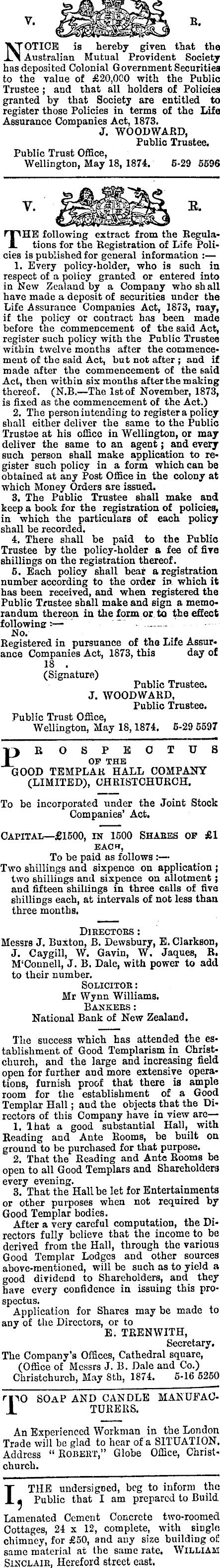 NOTICE is hereby given that the Australian Mutual Provident Society has deposited Colonial Government Securities to the value of £20,000 with the Public Trustee ; and that all holders of Policies granted by that Society are entitled to register those Policies in terms of the Life Assurance Companies Act, 1873. J, WOODWARD, Public Trustee. Public Trust Office, Wellington, May 18, 1874. 6-29 5596 V. E. THE following extract from the Regulations for the Registration of Life Policies is published for general information : 1. Every policy-holder, who is such in respect of a policy granted or entered into in New Zealand by a Company who shall have made a deposit of securities under the Life Assurance Companies Act, 1873, may, if the policy or contract has been made before the commencement of the said Act, register such policy with the Public Trustee within twelve months after the commencement of the said Act, but not after ; and if made after the commencement of the said Act, then within sis months afterthe making thereof. (N.B. —The Ist of November, 1873, is fixed as the commencement of the Act.) 2. The person intending to register a policy shall either deliver the same to the Public Trustee at his office in Wellington, or may deliver the; same to an agent; and every such person shall make application to register such policy in a form which can be obtained at any Post Office in the colony at which Money Orders are issued. 3. The Public Trustee shall make and keep a book for the registration of policies, in which the particulars of each policy shall be recorded. 4. There shall be paid to the Public Trustee by the policy-holder a fee of five shillings on the registration thereof. 5. Each policy shall bear a registration number according to the order in which it has been received, and when registered the Public Trustee shall make and sign a memorandum thereon in the form or to the effect following : No. Registered in pursuance of the Life Assurance Companies Act, 1873. this day of 18 . (Signature) Public Trustee. J. WOODWARD, Public Trustee. Public Trust Office, Wellington, May 18,1874. 5-29 5597 CT U S PR O S P E OP THE GOOD TEMPLAR HALL COMPANY (LIMITED), CHRISTCHURCH. To be incorporated under the Joint Stock Companies’ Act. Capital—£lsoo, in 1500 Shares op £1 EACn, To be paid as follows : Two shillings and sixpence on application ; two shillings and sixpence on allotment; and fifteen shillings in three calls of five shillings each, at intervals of not less than three mouths. Dl RECTORS: Messrs J. Buxton, B. Dewsbury, E. Clarkson, J. Caygill, W. Gavin, W. Jaques, R. M‘Connell, J. B. Dale, with power to add to their number. Solicitor : Mr Wynn Williams. Bankers : National Bank of New Zealand. The success which has attended the establishment of Good Templarism in Christchurch, and the large and increasing field open for further and more extensive operations, furnish proof that there is ample room for the establishment of a Good Templar Hall; and the objects that the Directors of this Company have in view are—1. That a good substantial Hall, with Reading and Ante Rooms, be built on ground to be purchased for that purpose. 2. That the Reading and Ante Rooms be open to all Good Templars and Shareholders every evening. 3. That the Hall be let for Entertainments or other purposes when not required by Good Templar bodies. After a very careful computation, the Directors fully believe that the income to be derived from the Hall, through the various Good Templar Lodges and other sources above-mentioned, will be such as to yield a good dividend to Shareholders, and they have every confidence in issuing this prospectus. Application for Shares may be made to any of the Directors, or to E. TEEN WITH, Secretary. The Company’s Offices, Cathedral square, (Office of Messrs J. B. Dale and Co.) Christchurch, May Bth, 1874. 5-16 5250 rpo SOAP AND CANDLE MANUFACi TURERS. An Experienced Workman in the London Trade will be glad to hear of a SITUATION. Address “ Robert,” Globe Office, Christchurch. I THE undersigned, bog to inform the Public that I am prepared to Build. Lamenated Cement Concrete two-roomed Cottages, 24 x 12, complete, with single chimney, for £SO, and any size building of same material at the same rate. William Sinclair, Hereford street east.