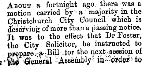 About a fortnight ago there was a motion carried by a majority in the Christchurch City Council which is deserving of more than a passing notice. It was to the effect that Dr Foster, the City Solicitor, be instructed to prepare p Bill lor the next session of »*fSJ general Aeßeiably in order to
