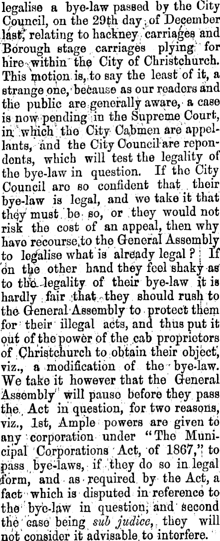 legalise a bye-law pasised by the City Council, on the 29th day v of December last£ relating to hackney carriages and Borough stage carriages plying for hire within the City of Christchurch. This inotipn is, to say the least of it, a strange one, because as our readers and the public are generally aware, a case is now pending in the Supreme Court, in which the City Cabmen are appellants, and the City Council are repondents, which will test the legality of the bye-law in question. If the City Council aro so confident their bye-law is legal, and we take it that they must be so, or they would not risk the cost of an appeal, then why havo recourse.to the General Assembly to legalise what is already legal ? j If on the other hand they feel shaky as to the. legality of their bye-law ft is hardly fair that they should rush to the General Assembly to protect them for their illegal acts, and thus put it out of the power of the cab proprietors of Christchurch to obtain their object, viz., a modification of the bye-law.. We take it however that the General Assembly will pauso before they pass the Act in question, for two reasons, viz., Ist, Ample powers are given to any corporation under "The Municipal Corporations Act, of 1867,'? to pass bye-laws, if they do so in legal form, and as required by the Act, a fact which is disputed in reference to the bye-law in question; and second the Gase being sub judice, they will not consider it advisable, to intorfere.