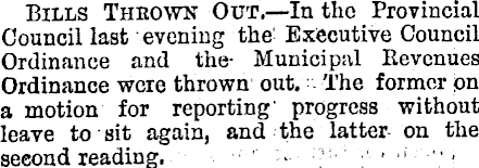 Bills Thrown Out. —In the Provincial Council last evening the Executive Council Ordinance and the- Municipal Revenues Ordinance were thrown out. The former on a motion for reporting progress without leave to sit again, and the latter on the second reading. •