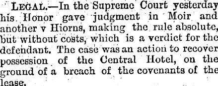 Legal.—ln the Supremo Court yesterday his. Honor gave judgment in Moir and another v Hiorns, making the rule absolute, but without costs, which is a verdict for the defendant. The case was an action to recover possession of the Central Hotel, on the ground of a breach of the covenants of the lease.