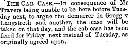 The Cab Case. —In consequence of Mr Travers being unable to be here before Tuesday next, to argue the demurrer in Gregg v Langstreth and another, the case will be taken on that day, and the cab case has been fixed for Friday next instead of Tuesday, as originally agreed upon.