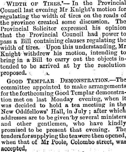 Width op Tikes/ — In the Provincial Council last evening Mr Knight's motion for regulating the width of tires on the roads of the province created some discussion. _ The Provincial Solicitor expressed his opinion thut the Provincial Council had power to pass a Bill containing clauses regulating the width of tires. Upon this understanding, Mr Knight withdrew his motion, intending to bring in a Bill to carry out the objects intended to be arrived at by the resolution proposed. «. Good Templar Demonstration.— The committee appointed to make arrangements for the forthcoming Good Templar demonstration met on last Monday evening, when it was decided to hold a tea meeting in the New Oddfellows' Hall, in July ; after which addresses are to be given'by several ministers and other gentlemen, who have kindly promised to be present that evening. The tendersf or supplying the teawere then opened, when that of Mr Poole, Colombo street, was accepted,