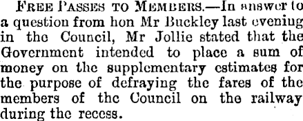 Free Passes to Members. —In wiswor to a question from hon Mr Buckley last evening in the Council, Mr Jollie stated that the Government intended to place a sum of money on the supplementary estimates for the purpose of defraying the fares of the members of the Council on the railway during the recess.