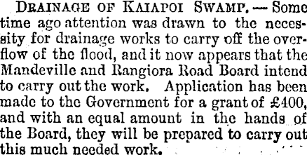 Drainage op Kaiapoi Swamp. Some time ago attention was drawn to the necessity for drainage works to carry off the overflow of the flood, and it now appears that the Mandeville and llangiora Road Board intend to carry out the work. Application has been made to the Government for a grant of £4OO, and with an equal amount in the hands of the Board, they will be prepared to carry out this much needed work.