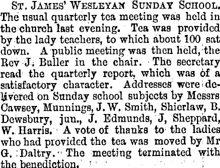 St. James' Wesleyan Sunday School. The usual quarterly tea meeting was held in the church last evening. Tea was provided by the lady teachers, to which about 100 sat down. A public meeting was then held, the Bev J; Buller in the chair. The secretary read the quarterly report, which was of a satisfactory character. Addresses were delivered on Sunday school subjects by Messrs Cawsey, Munnings, J. W. Smith, Shierlaw, B. Dewsbury, jun., J. Edmunds, J, Sheppard, W. Harris. A vote of thanks to the ladies who had provided the tea was moved by Mr Q-. Daltry. The meeting terminated with the benediction,
