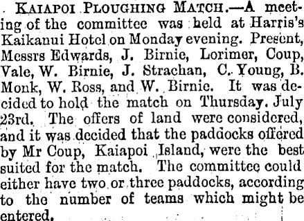 Kaiapoi Ploughing Match.—A meeting of the committee was held at Harris's Kaikanui Hotel on Monday evening. Present, Messrs Edwards, J. Birnie, Lorimer, Coup, Vale, W. Birnie, J. Strachan, C. Young, B. Monk, W. Boss, and W. Birnie. It was decided to hold the match on Thursday. July 23rd. The offers of land were considered, and it was decided that the paddocks offered by Mr Coup, Kaiapoi Island, were the best suited for the match. The committee could either have two or three paddocks, according to the number of teams which might be entered.